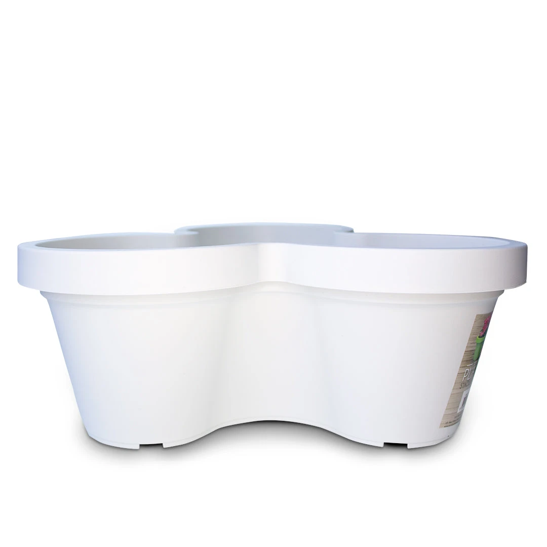 Each has three spaces combined like the shape of a clover, each suited to a plant approximately 18cm in diameter. The three spaces each have a drainage hole and it comes with plugs so you can use it indoor or outdoor.