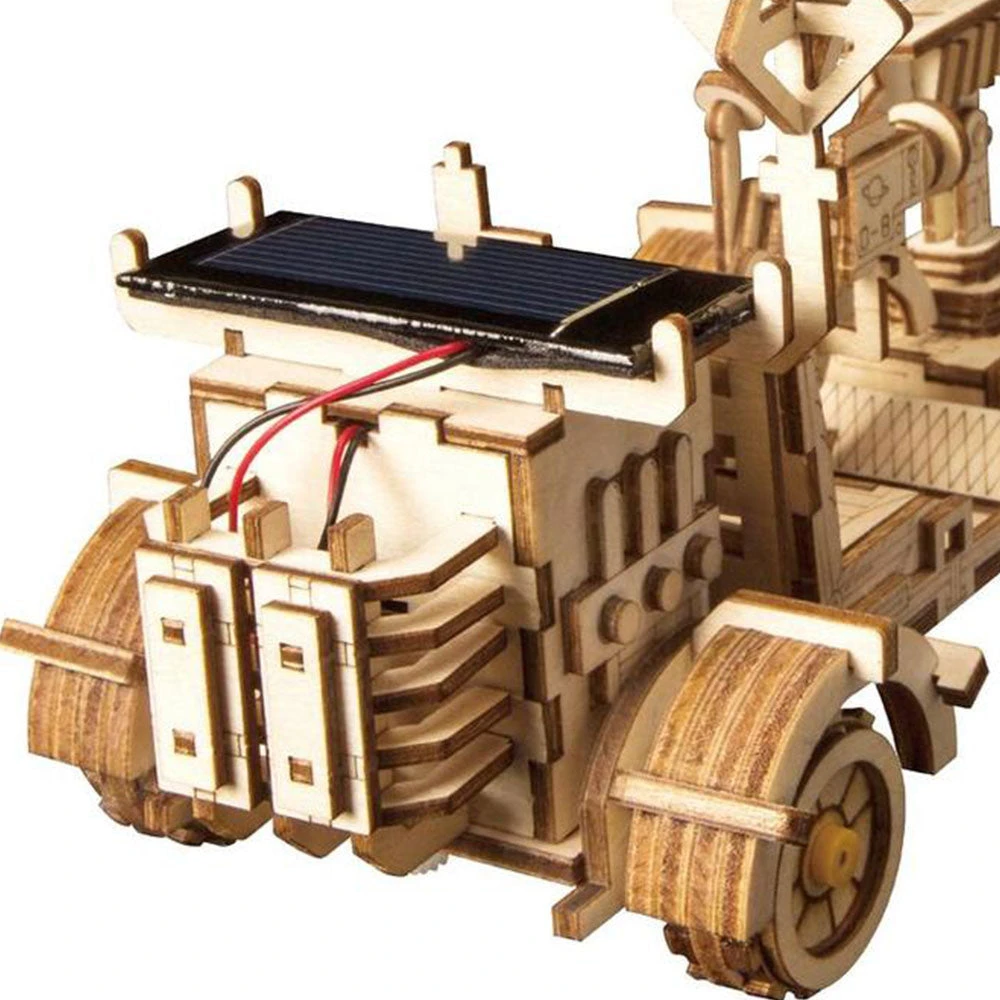 The 175Â pre-cut wooden pieces fit together to build the machine, but this model does more than just look amazing on the shelf… It comes with a solar panel to power it which you can install easily yourself. No batteries required!