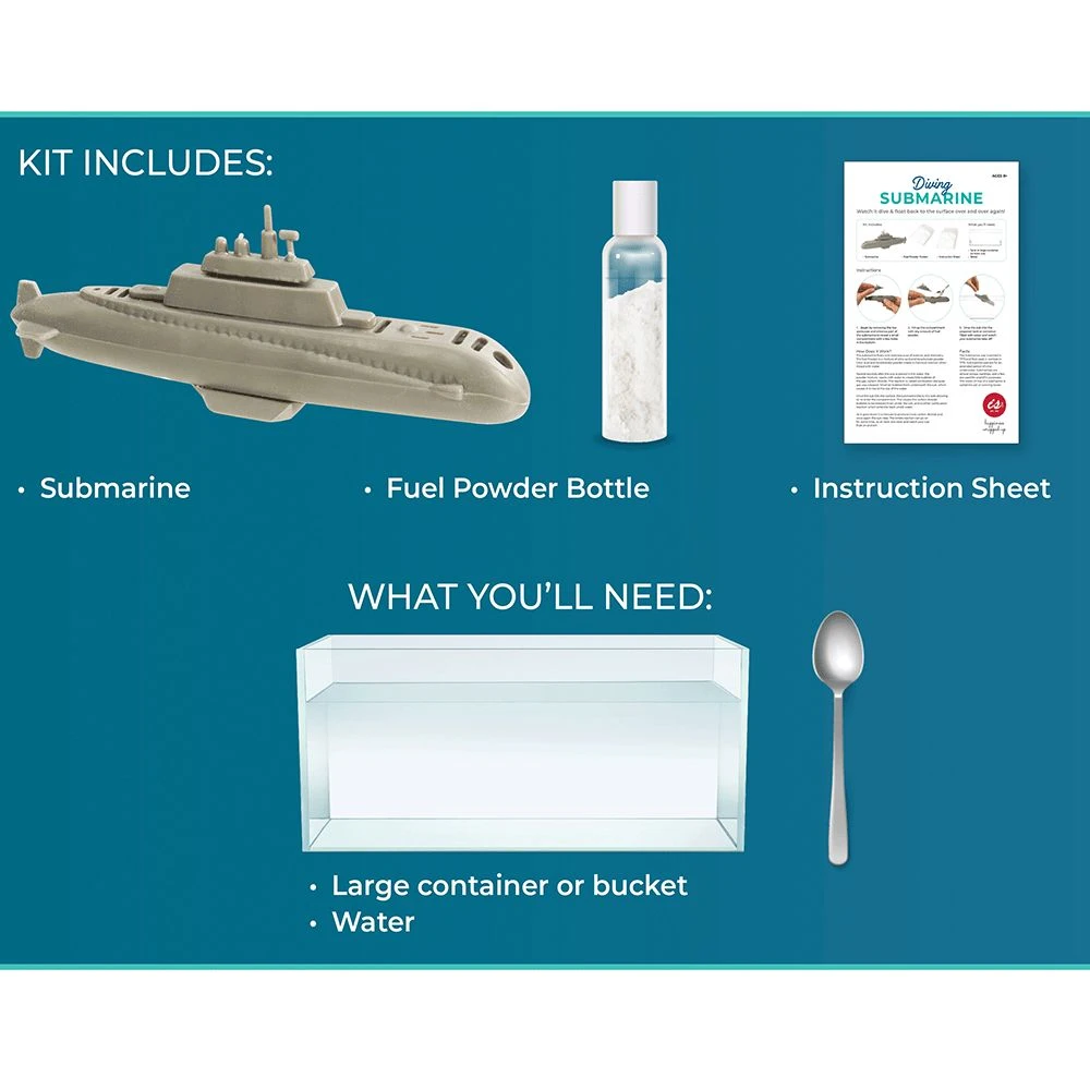 Learn about chemistry while you have fun in the tub with this diving submarine. Fill it with fuel powder and watch it dip, dive and rise in the bath or a container.Â