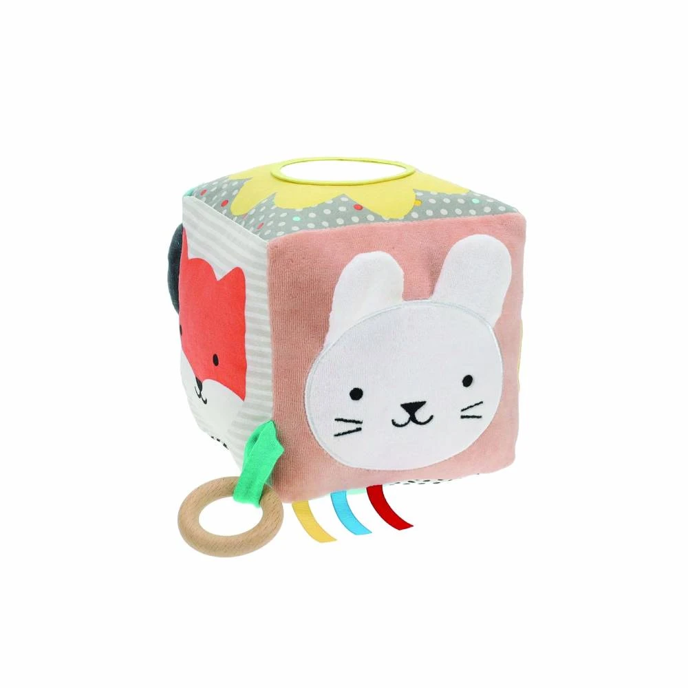 This activity block comes with six sides of fun! Your little one will be able to enjoy the vibrant colours, tug on the ribbon tags, discover their reflections in the mirror as well as interact with crinkle accents and a wood teether. There’s also four friendly and adorable animal faces printed on this block!