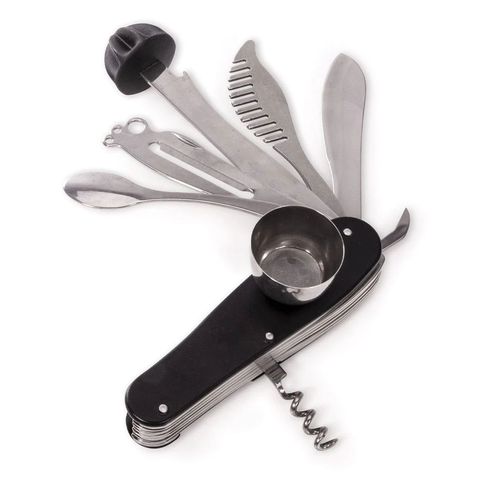 - Includes: Muddler, reamer, strainer, knife, bottle opener, spirit measure, corkscrew, stirrer, peeler, zester, channel knife