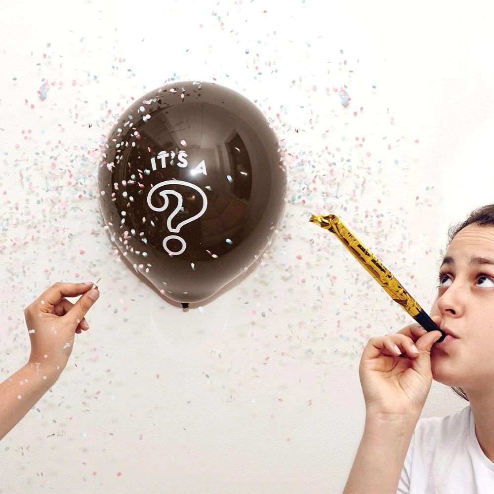- Inclusions: 2 x black balloons, push pin, 2 x party blowers, 1 x bag pink confetti, 1 x bag blue confetti