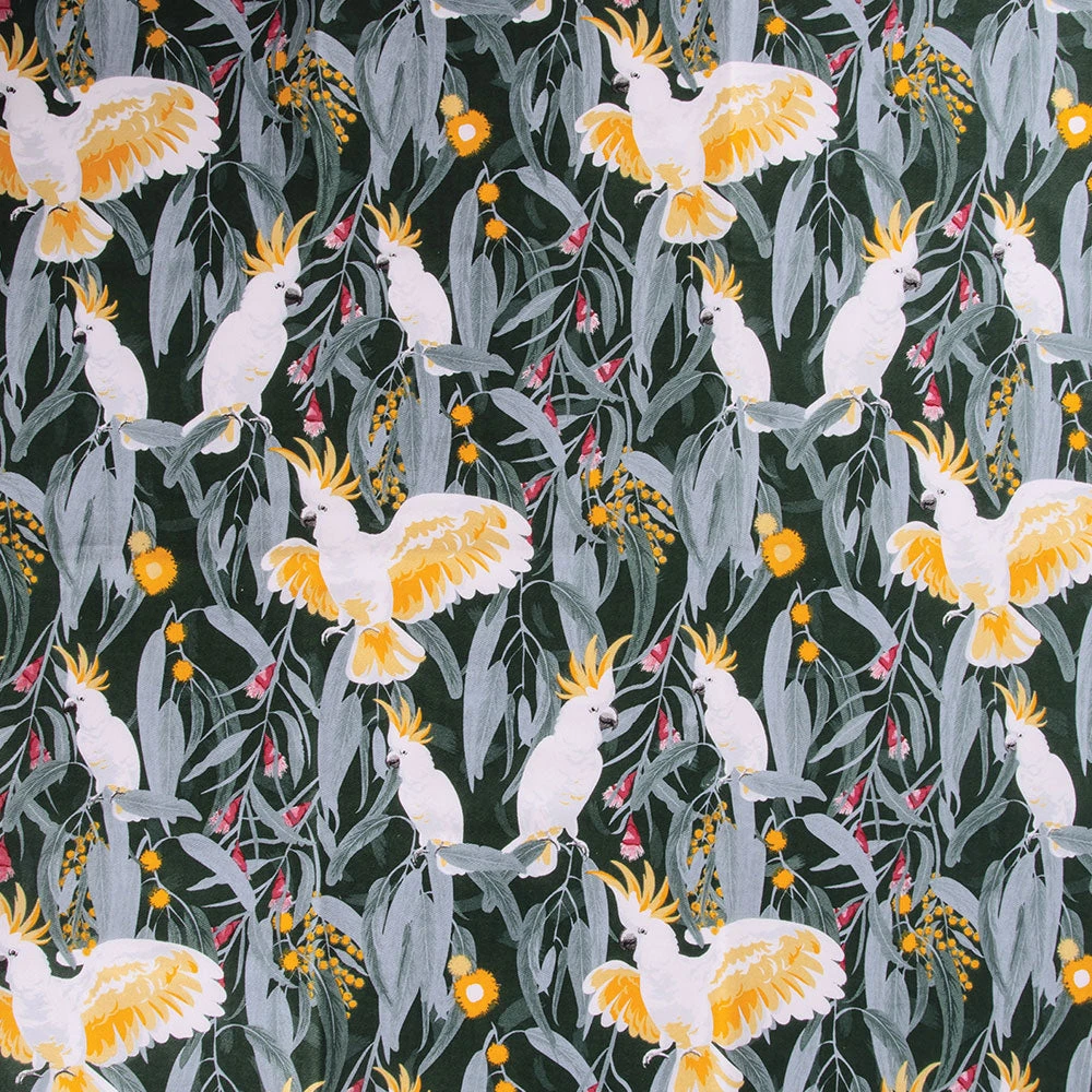 It comes in a set of two, with one showing the beautiful rainbow lorikeet on a dusty pink background. The other has the impressive sulphur-crested cockatoo on a dark green to truly pop. Both have local leaves and flowers to really set the scene.Â