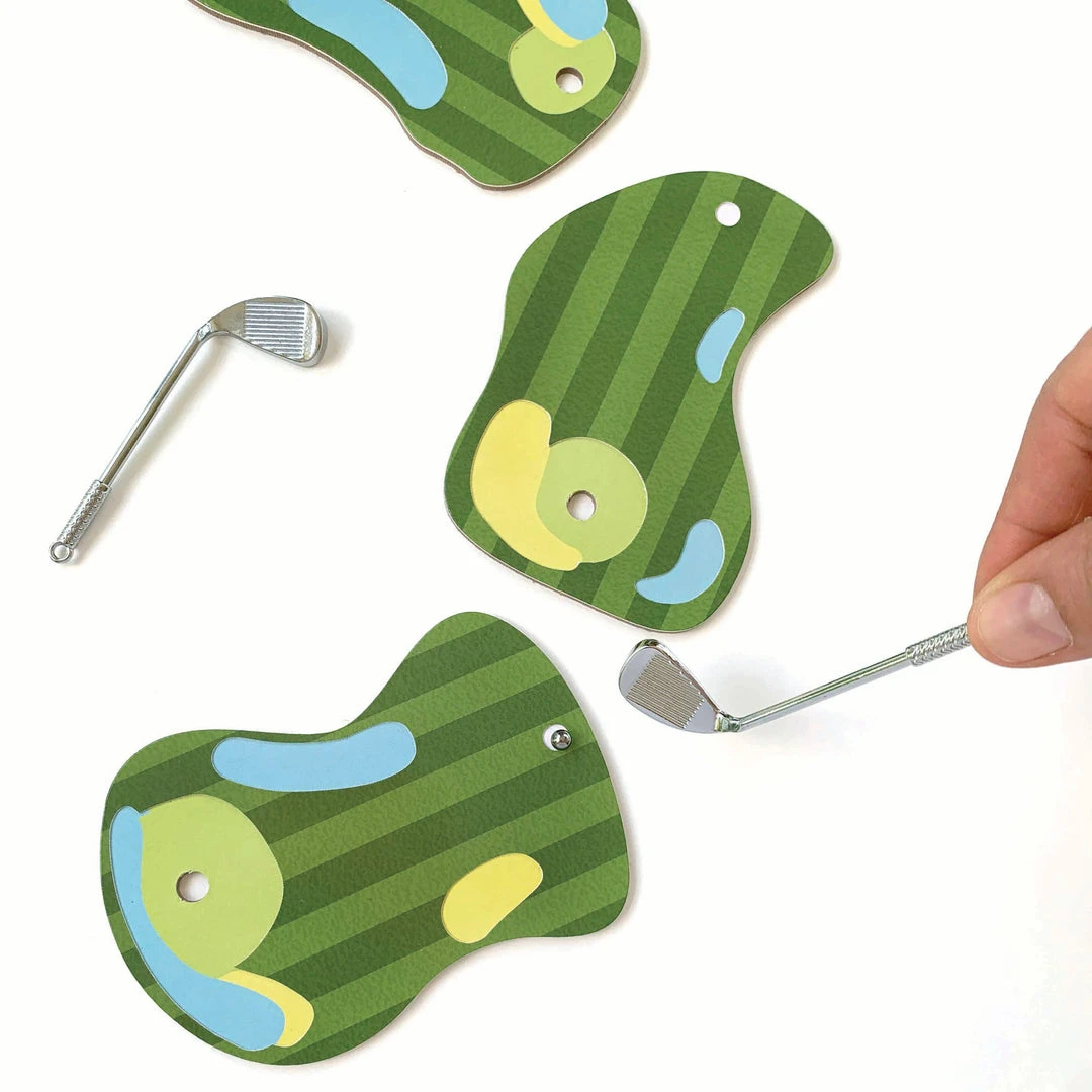- Inclusions: 9 x Sheets with different holes to play, 2 x Metal balls, 2 x 3-inch golf clubs.