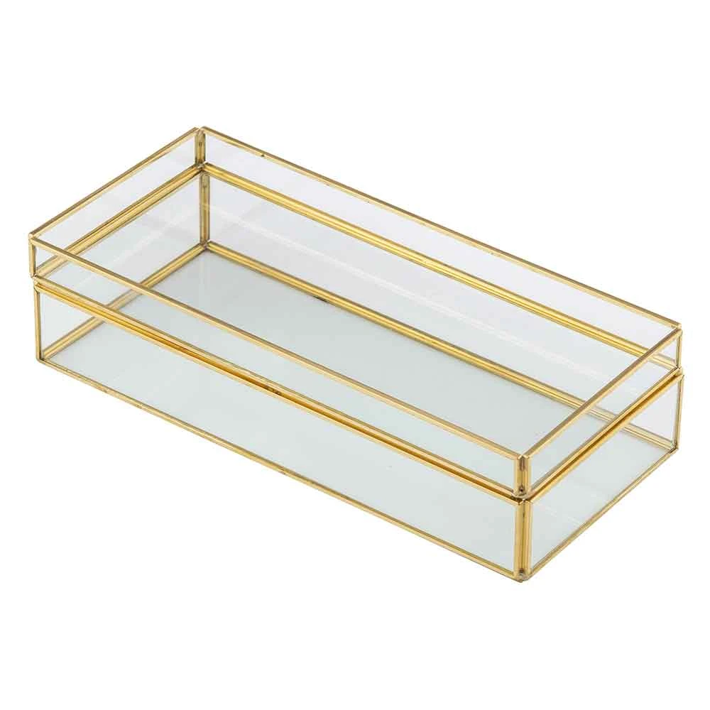 It is clear glass with gold at the joins, and the lid doubles as a helpful tray. It’s perfect for storing jewellery, coins, trinkets, stationary, really anything that fits. Plus it will elevate the style of any room, from the bedroom to the office.