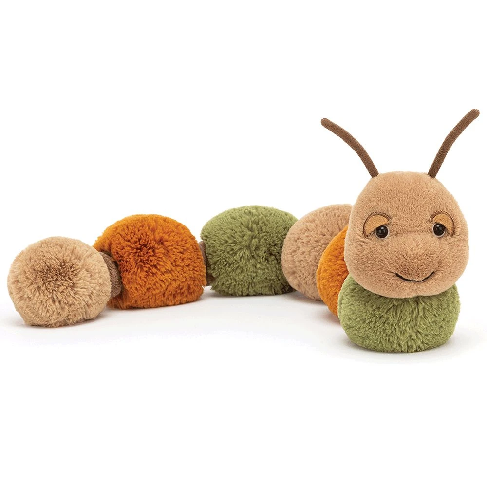 From adventures in the garden to naps in the sun of the soft green grass, Figgy Caterpillar loves spending time with his favourite people. He’s got little brown cord bits between his burnt orange, grass green and warm beige body parts and sleepy little eyelids.