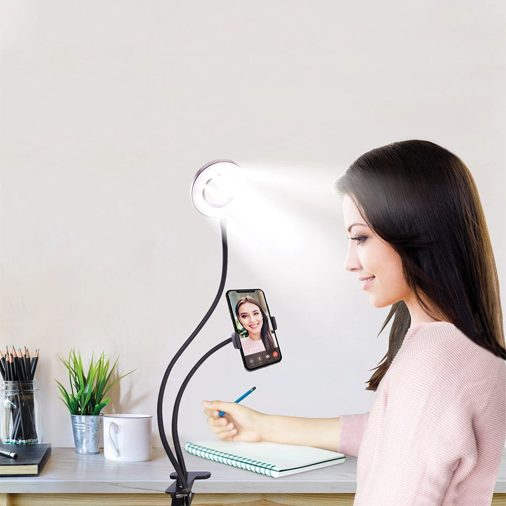 It simply clamps on to the desk and has a 35cm arm that holds your phone and a 63cm arm that holds a ring light. The ring light has 10 different brightness levels with warm, cool or blended lights.