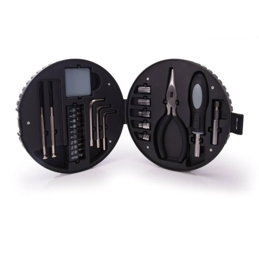 - Inclusions: 1 x Long Nose Pliers, 1 x Screwdriver Handle, 1 x Extension Bar, 5 x Sockets, 3 x Hex Keys, 2 x Precision Screwdrivers, 1 x 1m Measuring Tape & 10 x Screwdriver Adapters in a wheel shaped case.