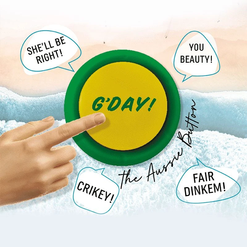 The 10 different Aussie phrases are a great way for foreigners to start learning Aussie lingo. Beautifully packaged and with batteries included, The G’Day Aussie Button is a bloody rippa of a pressie for honourary Aussies!