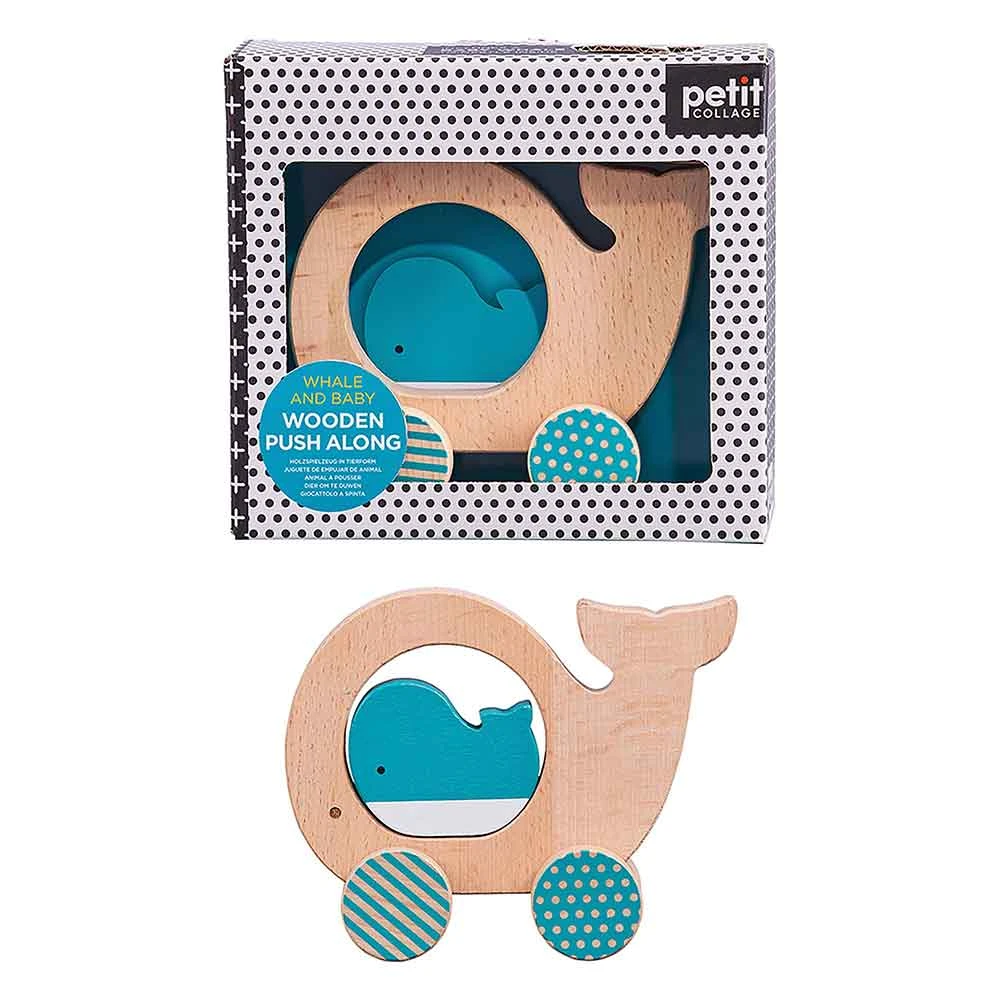It’s a classic wooden push along toy with simple natural colours and teal features. There’s also a tiny teal baby whale that nestles neatly in the centre of the toy, so it kind of doubles as a puzzle!Â