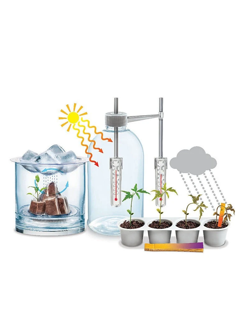 - Contains 1 x balloon, 1 x cloud-shape cover, 1 x mountain shape, 1 x pimpled stopper, 1 x mountain base, 1 x cloud-making pump, 2 x thermometer arm, 2 x thermometer holders, 1 x pencil stand,2 x spiral template, 2 x thermometers, 1 x seed tray, pH test paper and detailed instruction.