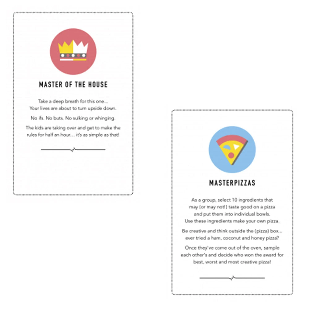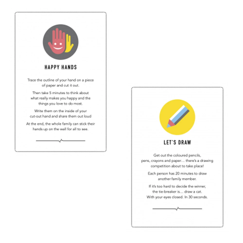 There’s some activities to bring out your creative side, some to help you share your feelings and deepen bonds and some just to make everyone laugh! This game is designed for kids aged 5-13, but everyone will be able to take something great away from the experience.Â