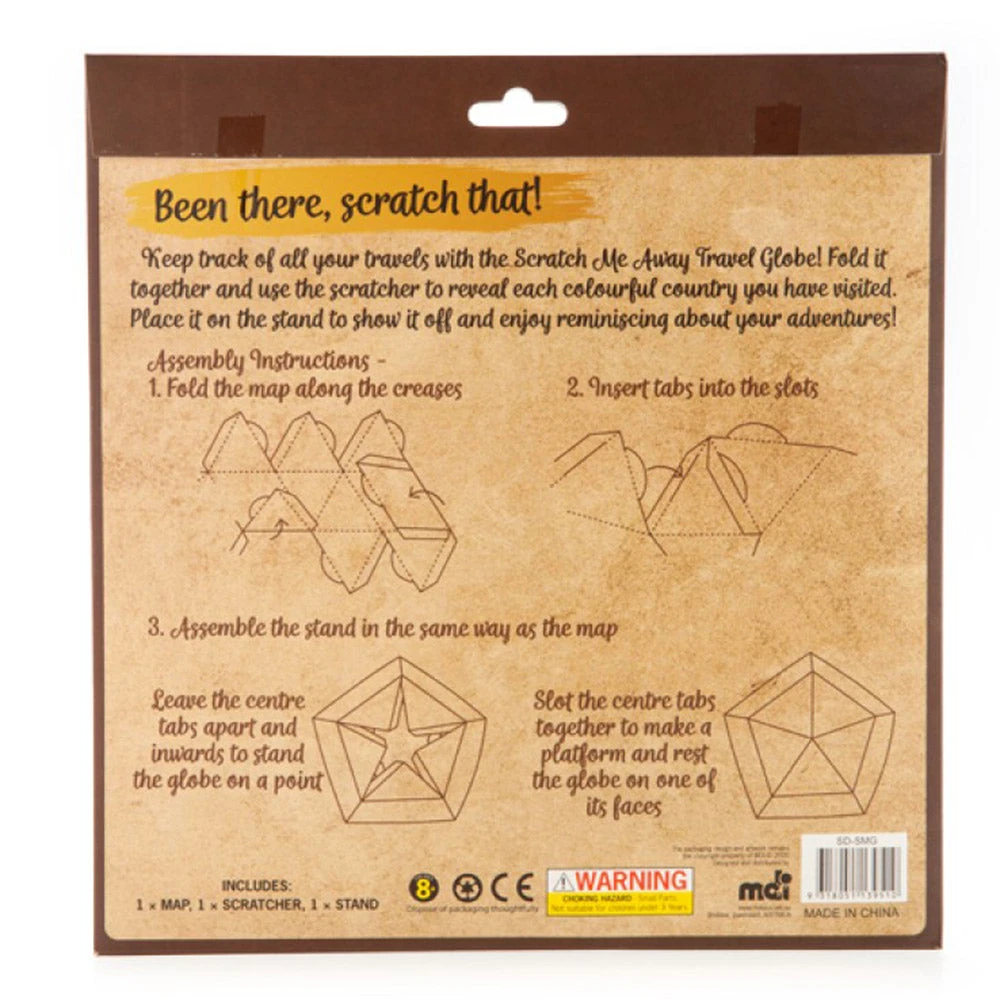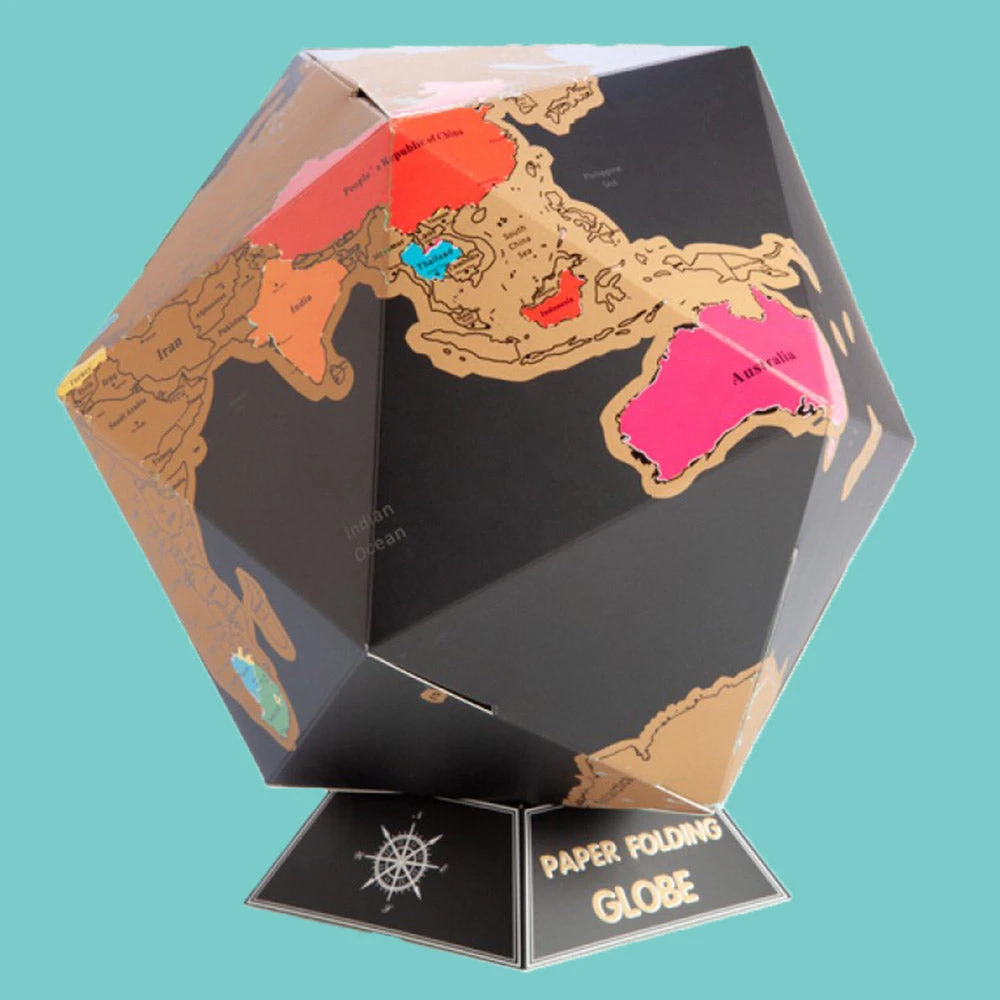 Fold the pieces into a super cool angular cardboard world globe. You can scratch the map to keep track of all the places you travel, and display it on the included stand.