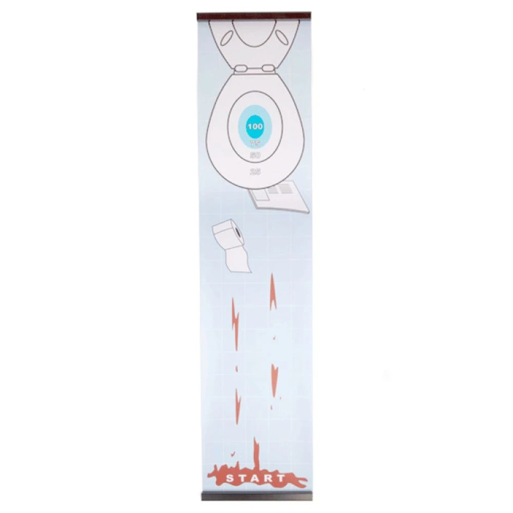 Lay out the 1.2 metre curling mat and take in all the glory. The final target is the toilet bowl, and they’ve decorated the tile-look mat with skid marks all the way down.Â