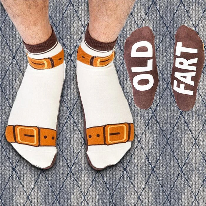 They’re printed with a pattern that mimics the ever-so-chic socks with sandals look, and when the wearer sit down and lifts their soles off the ground, BEHOLD: the soles reveal a secret message that says “OLD FART”!