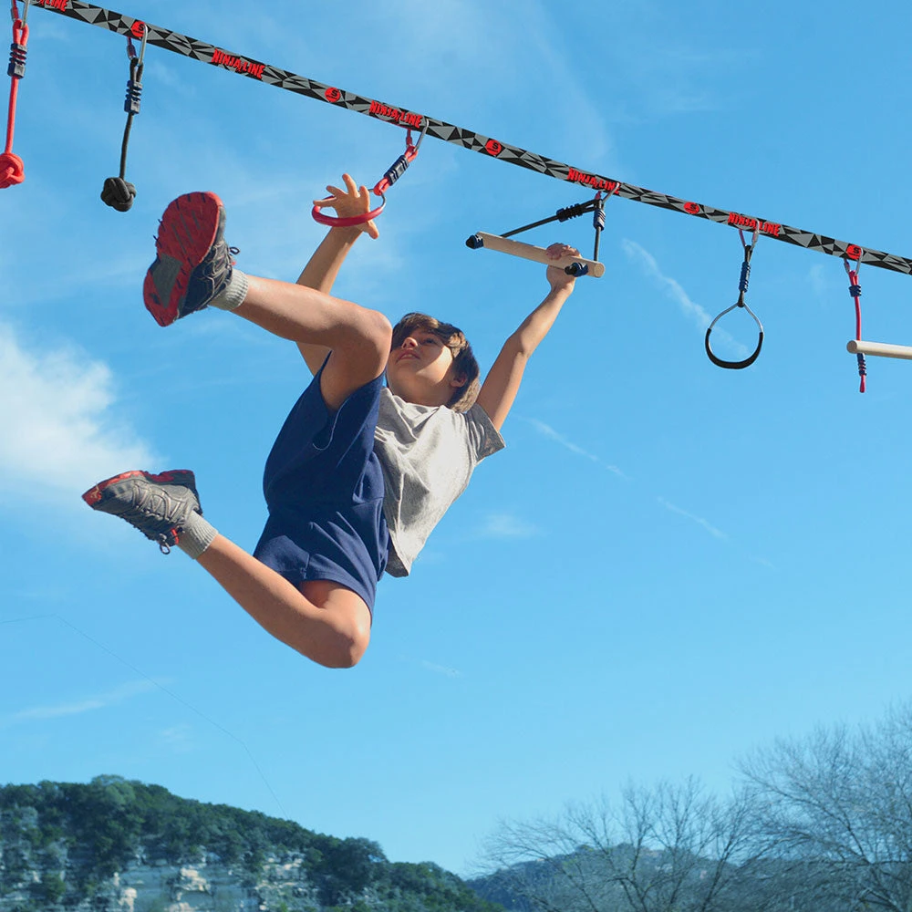 - Inclusions: 11m ninja line strap, 2 x gymnastics rings, 2 x monkey fists, 2 x monkey bars, traverse ring, carrying bag, ratchet cover, 2 x ninja grip clips