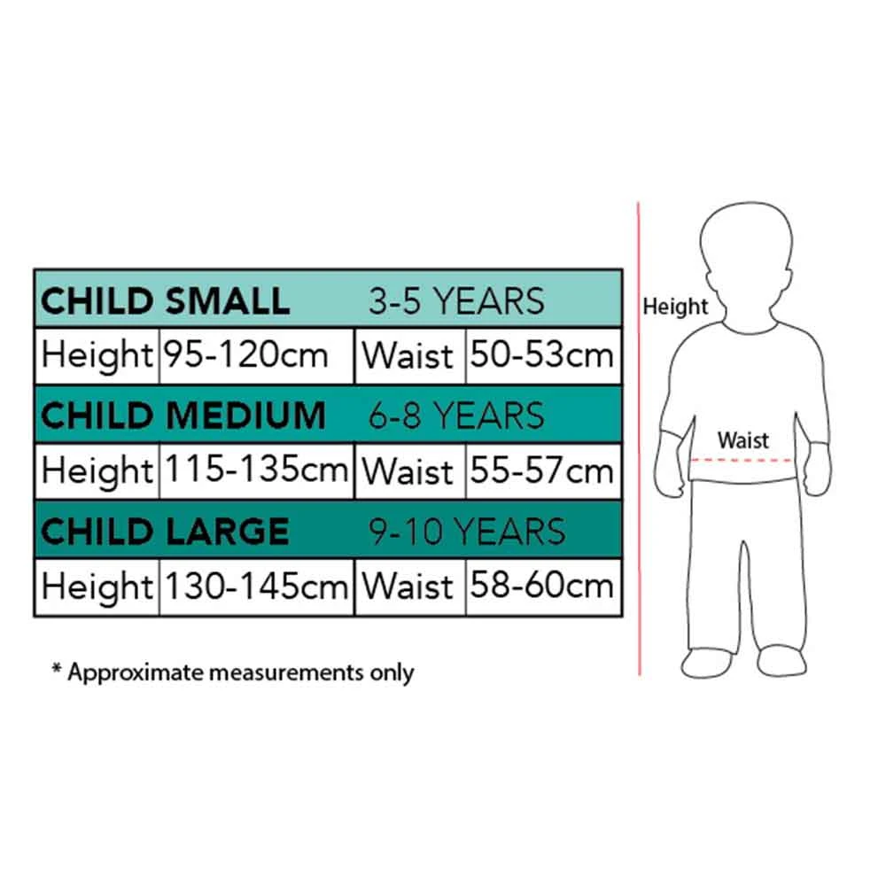- Sizes:Â 3-5 years, 6-8 years, 9-10 years (see size chart for more information)