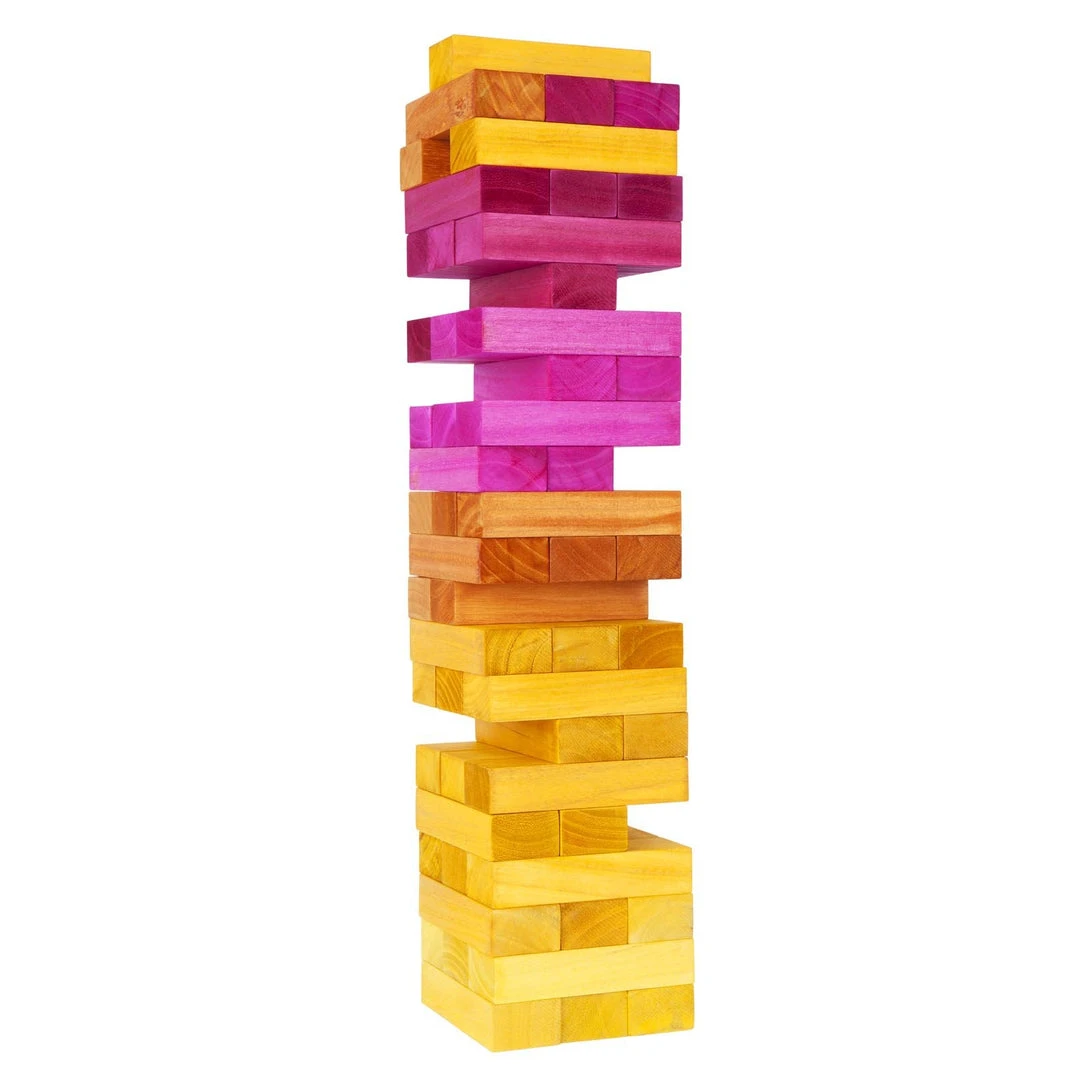Well, this game is based on that game but with a few small but super-fun differences. As you can see, these blocks are as brightly coloured as can be! All colours of the rainbow are there to stack, play and tumble! Also, to make it extra fun, the whole tower stacks to a large size, so it takes stacking your tower – and crashing your tower – to a whole other level!