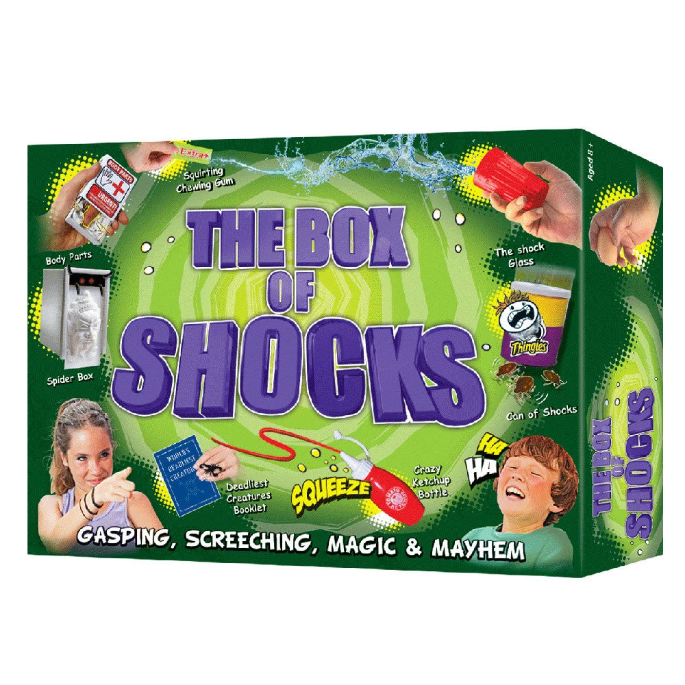 - Inclusions: Body parts box, Can of shocks, Spider box, Fake egg, Small plastic hand, Vanishing ink, Ketchup bottle, World’s deadliest creatures, The magic glass, Squirting Chewing Gum, Pen through hand, The finger breaker.