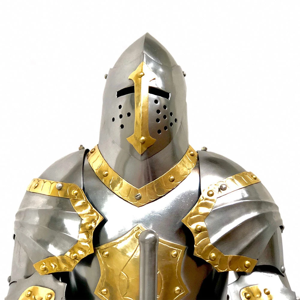 Now there’s a middle ground. This is a full suit of armour, standing on a wooden plinth. But this one is miniature, standing only 70.5cm tall! It’s the ultimate compromise. It’s an impressive handcrafted steel and brass piece, complete with helmet and sword.Â