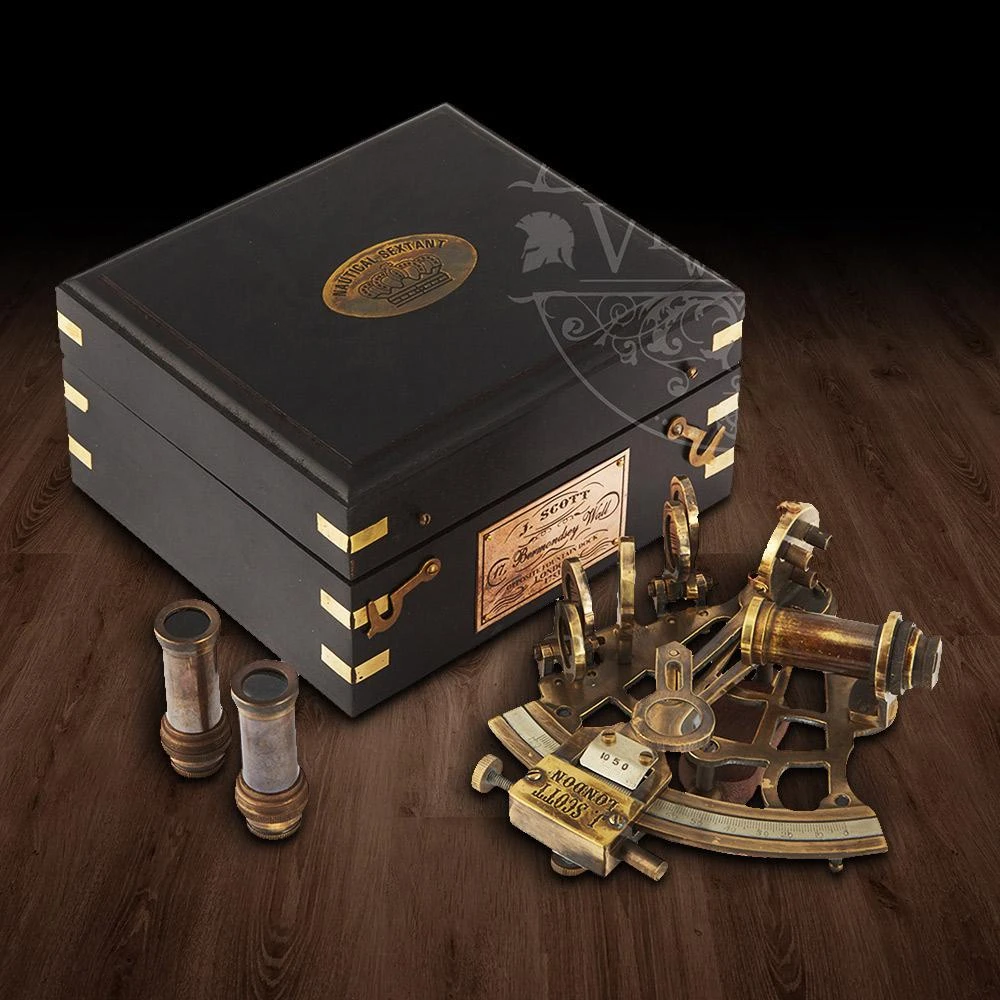 - Included: Brass sextant, felt-lined wooden case with brass details, 2 additional telescopes