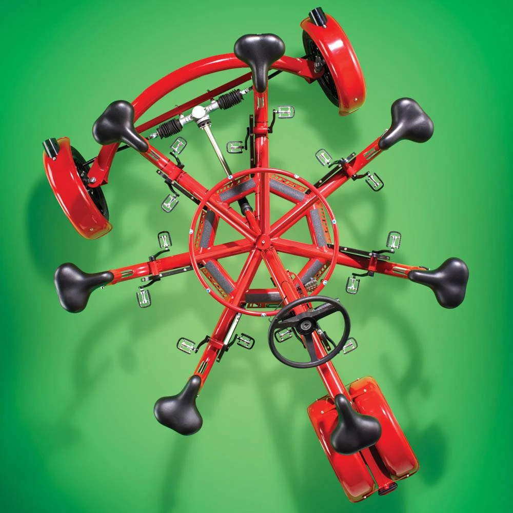 The seven-person-tricycle was designed by the great modern American artist Eric Staller. In 1991, he built the OCTOS – a circular bike for 8 riders, complete with futuristic black and white costumes. The reaction was astounding. “I could see that the OCTOS was something more powerful than art! It was something to be used and enjoyed by everyone. It was functional and there was never anything like it,” said Staller. He transformed his art into the functional seven-person-tricycle.
