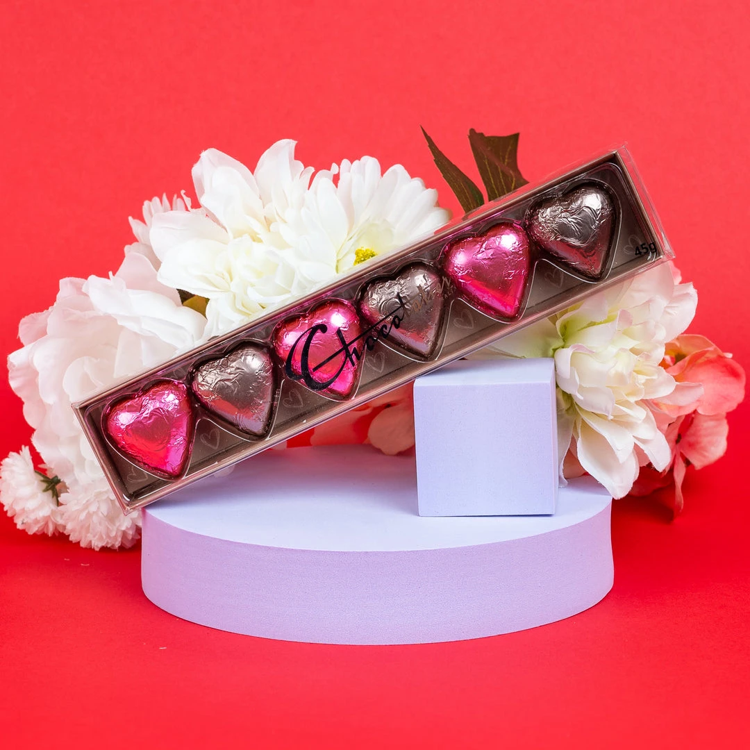 An indulgent night isn’t complete without the tasty Pink & Mocha Foiled Milk Chocolate Hearts! Packaged in a clear gift box, the pack of 6 milk chocolate hearts are smooth, creamy, and vegetarian-friendly. Once you pop one, you can’t stop!