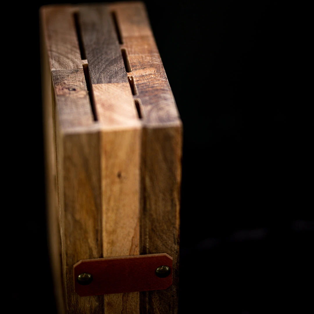 This mango wood knife block is the perfect addition to your kitchen counter. It has one solid row to fit as many knives as you can, and a second row with four slots of various sizes. There’s a small leather detail on the sides to add a little extra life to the design.